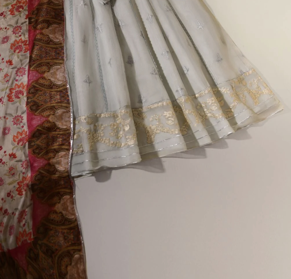 – Shirt Details: Soft pure hand loom cotton net with wild florals in feminine pink tones, floral embroidery work all over on both the front and back part. The hem of the pishwas is adorned with silver gotah and delicate embroidered border.